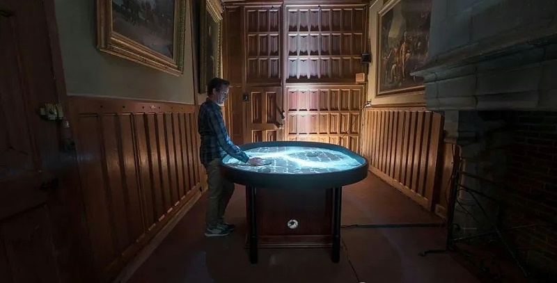 Lithos Ammos——意蕴深远的投影互动装置,原为昂布瓦斯博物馆量身定制,旨在以创新手法展现馆藏之精华。装置巧妙融合了古老文化与现代科技,将博物馆珍藏的细腻插图与原始羊皮卷轴,通过数字影像的投置于细腻白沙之上,白沙不仅铺满桌面,更寓意着邻近的卢瓦尔河畔。装置内置的鹅卵石,作为互动媒介,可触发沙面下隐藏的动态影像,仿佛穿越时空,唤醒沉睡于沙中的视觉宝藏。